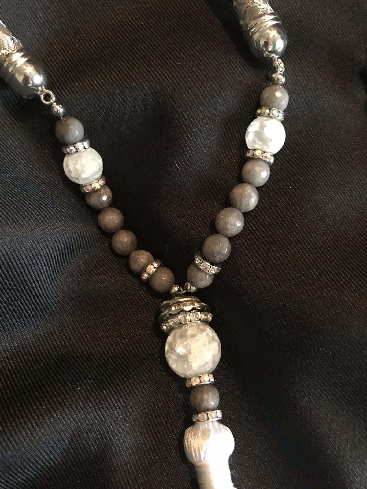 I visited a Goodwill Thrift store when out of town and found a gray drapery tie back and a necklace of gray beads – matching treasures. I paired them with some rhinestone spacers to produce a bit of sparkle.
