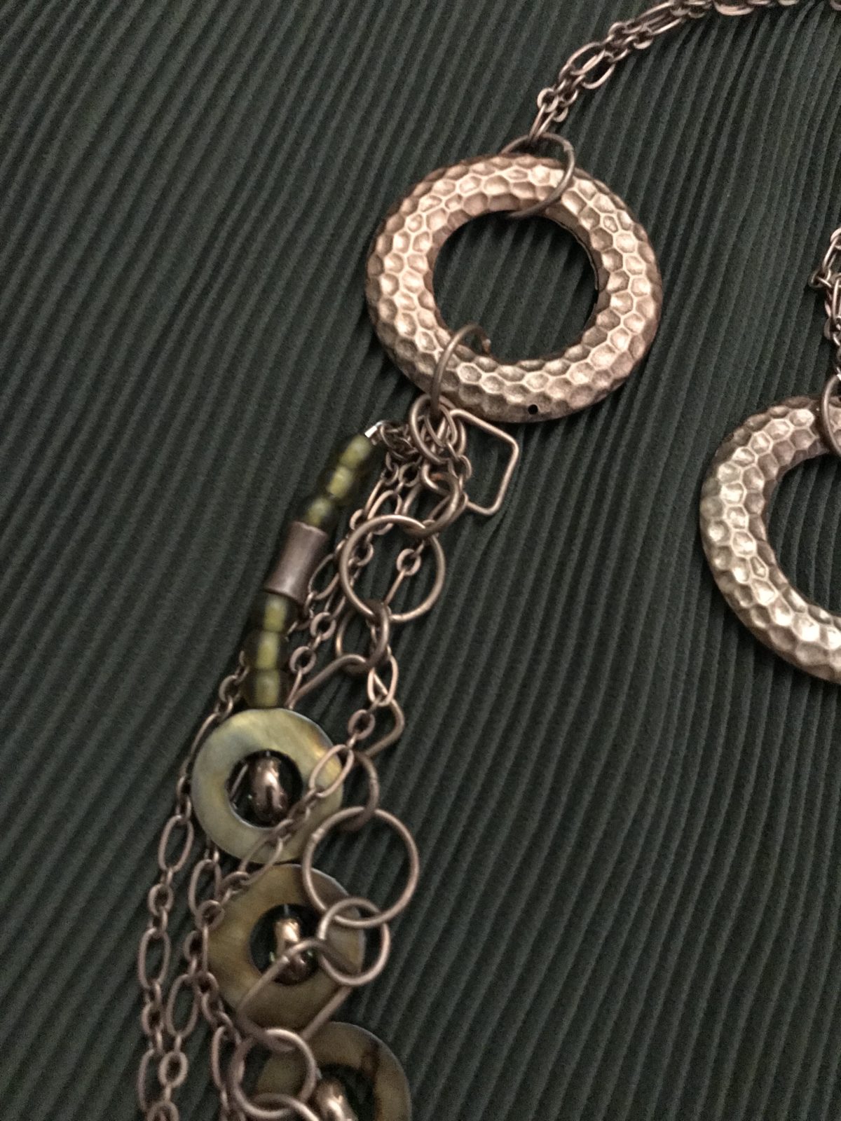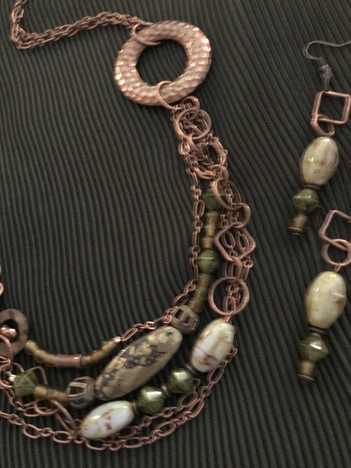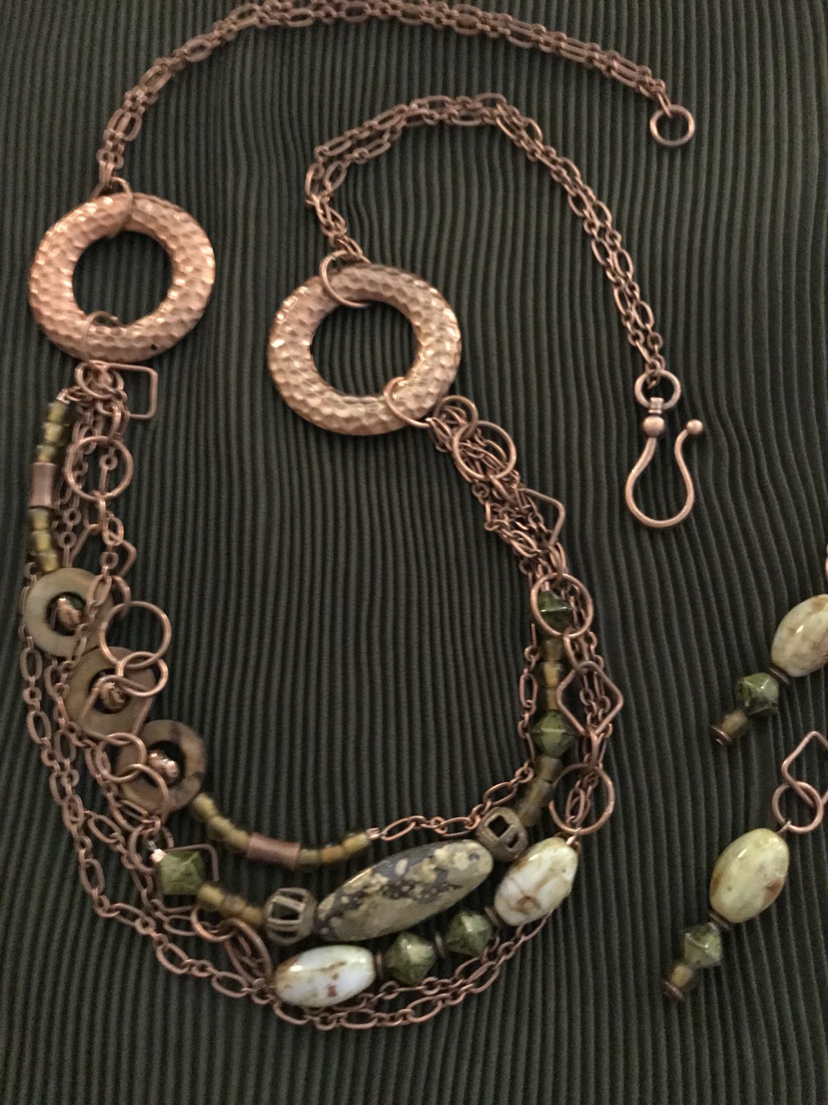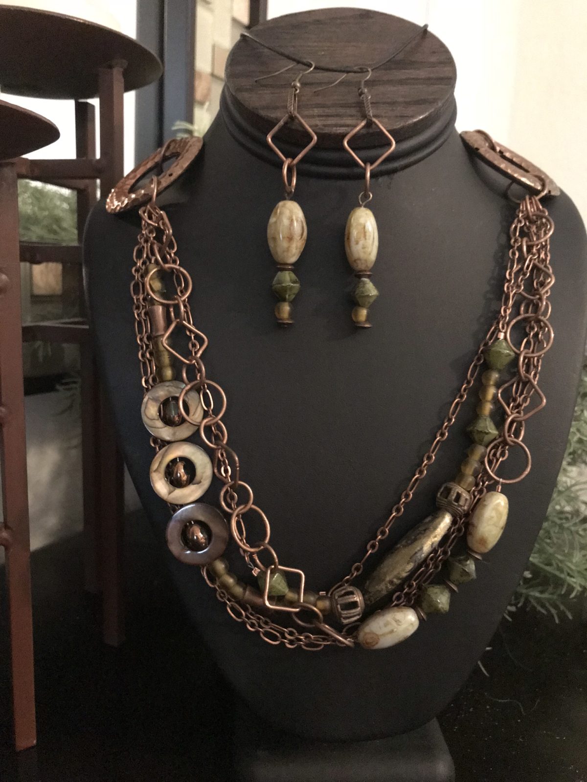 This multi-strand necklace combines the rusty, antiqued copper with olive green beads. The beads are a combination of shapes and sizes with each having their own character. I used multiple types of chain which all meet at the metal circles. Note that the earrings are fairly long…approximately 3″in length.