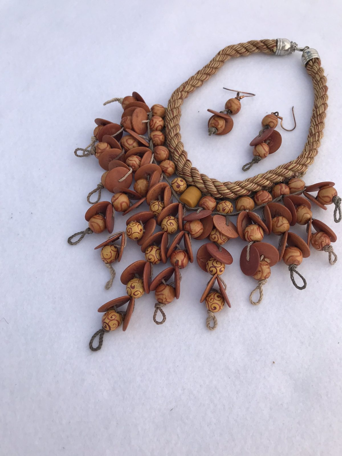 I was looking for treasures in a re-use art supply store when I found these lightweight wooden beads which appear to be made out of coconut shells.  The cording has the look of hemp rope but it is actually very soft and pliable.  What makes this piece interesting is the way the beads are strung and the soft clatter sound they make as they move together. Earrings included.
