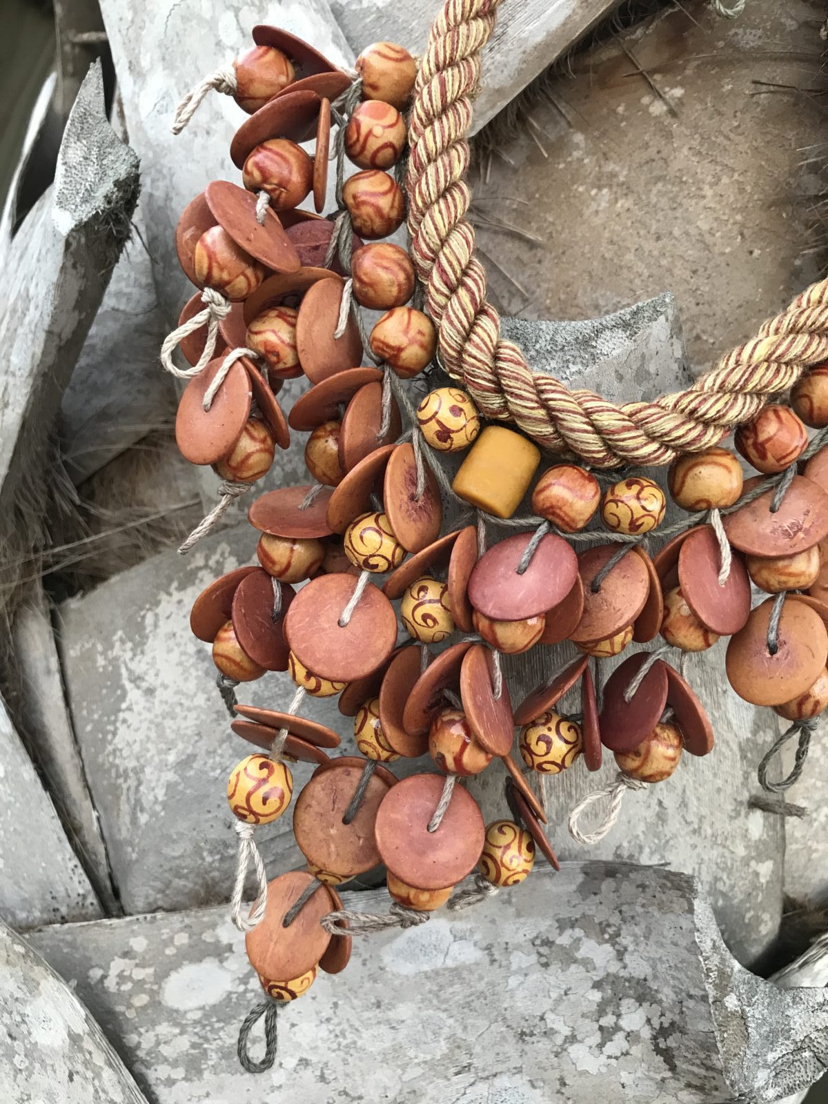 This piece has an interesting bead-stringing technique for the lightweight beads that appear to be made out of coconut shells.