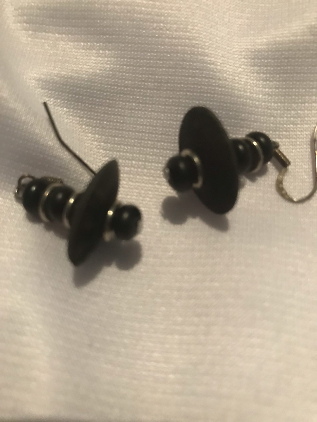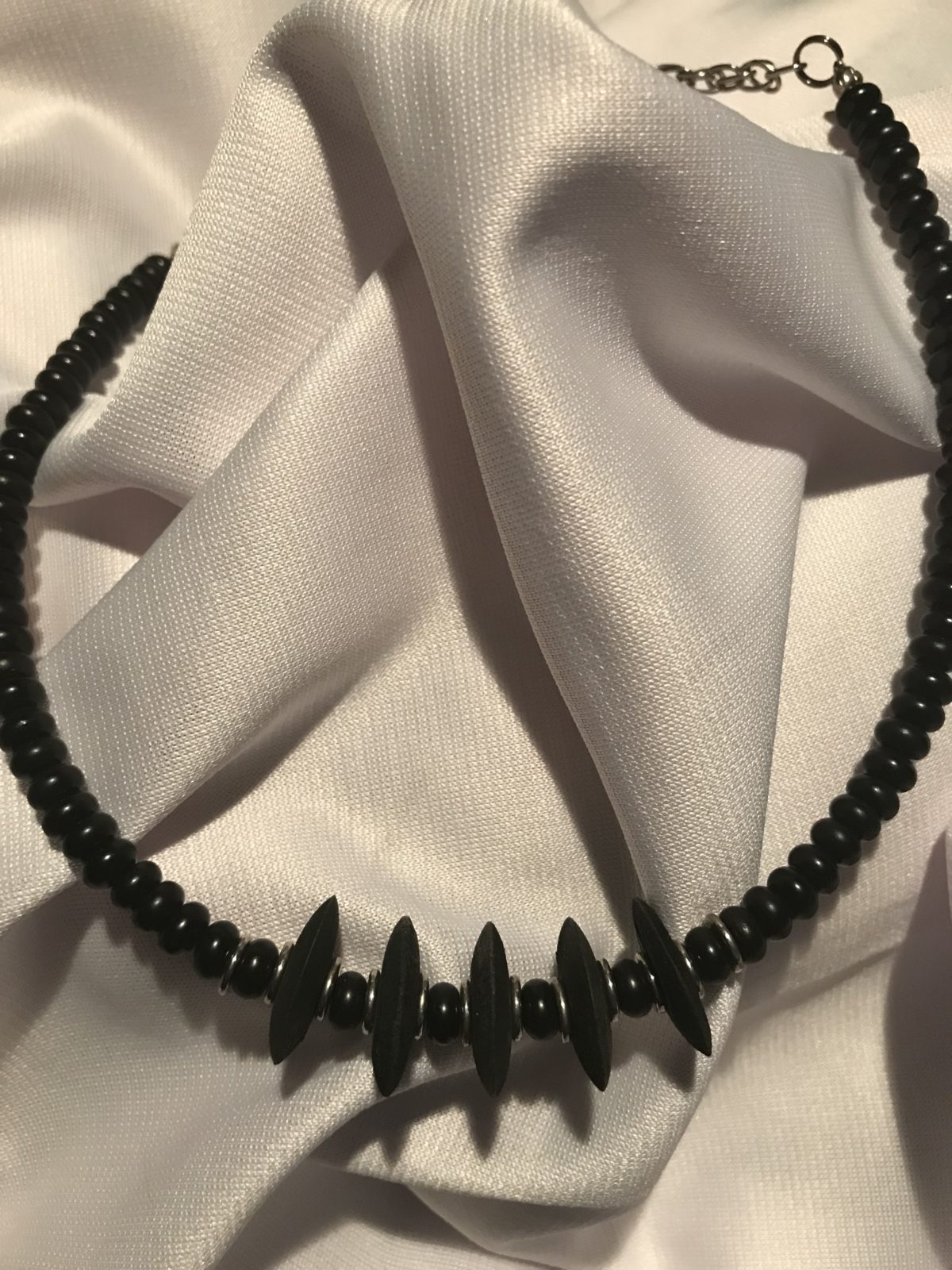 This one is very tailored and appropriate for that little black dress or for a business suit. It is made using round, angular black wooden beads with silver spacers. It is short and tailored for that “dress for success” look. Earrings included.