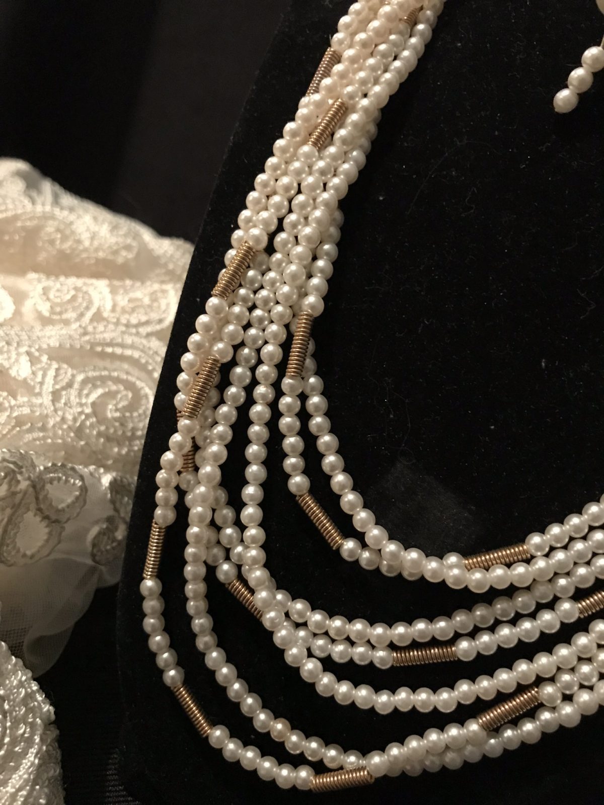 Every girl should have a set of pearls!  To make this piece “less stuffy” I added some gold colored coils which I thought also made the necklace more feminine. You have the option of wearing it just as it is or of twisting it on the sides. The length is adjustable as well. Earrings included.