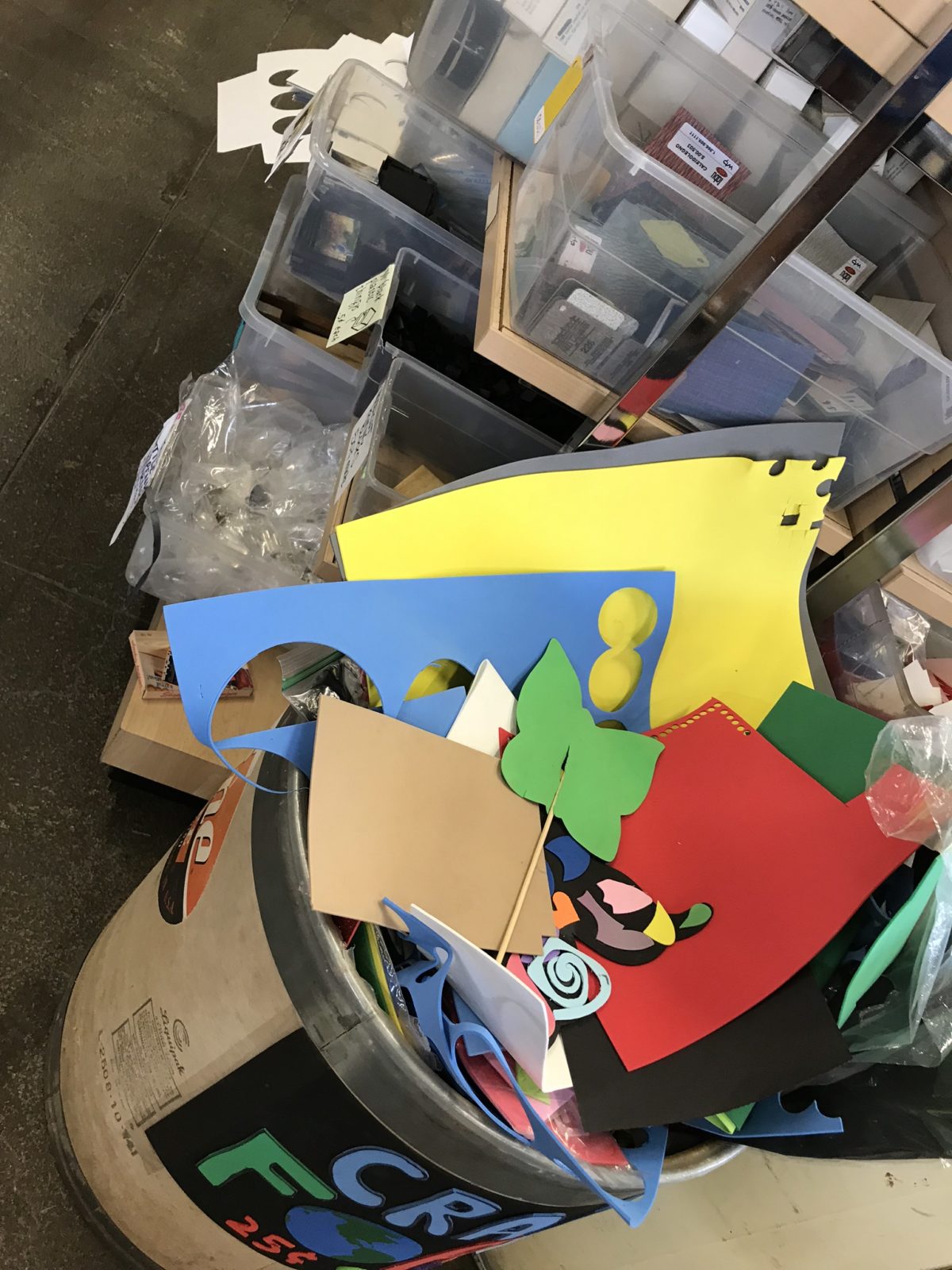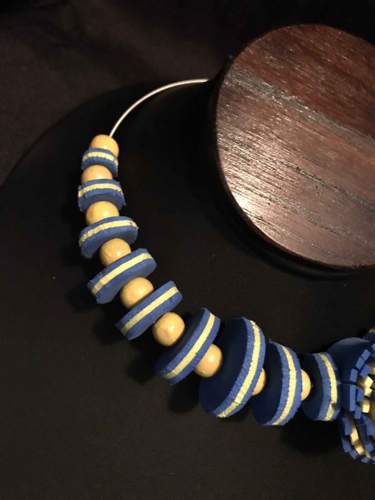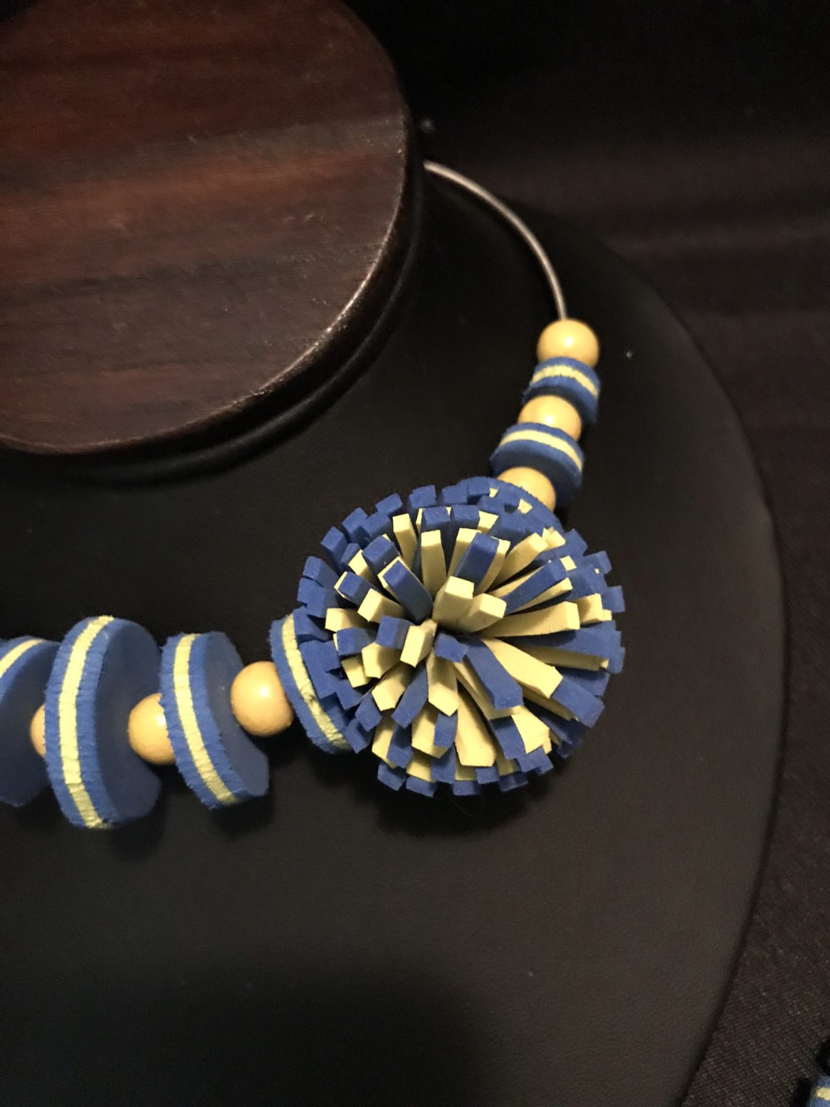 Back to my box of sheet rubber scraps…look at the additional images to see a photo of the barrel of sheet rubber scraps I found in an art supply re-use center. Not only are the colors vivid but this material is easy to cut, easy to glue and can be “carved” into almost any shape. It is virtually weightless so you won’t even know you are wearing a necklace.