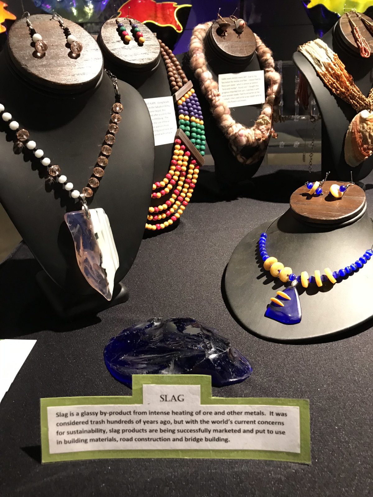 It was considered trash hundreds of years ago, but with the world’s current concerns for sustainability, slag products are being successfully marketed and put to use as building materials, road construction and bridge building. I have found several good chunks of brilliantly colored slag such as this one that have looked beautiful when polished for jewelry. You will see a photograph of a display at the WMODA with this piece and another which is pink and white slag. Earrings included.