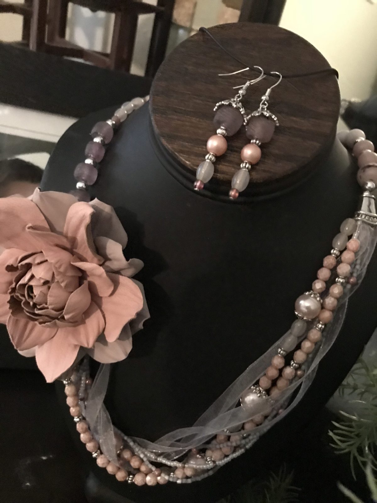 The piece is very dressy and ready for a party….would look incredible with a light gray dress. Take a close look at the eclectic bead styles used as the use of them in the same piece is very unexpected. Definitely one of my favorite pieces. Earrings included.