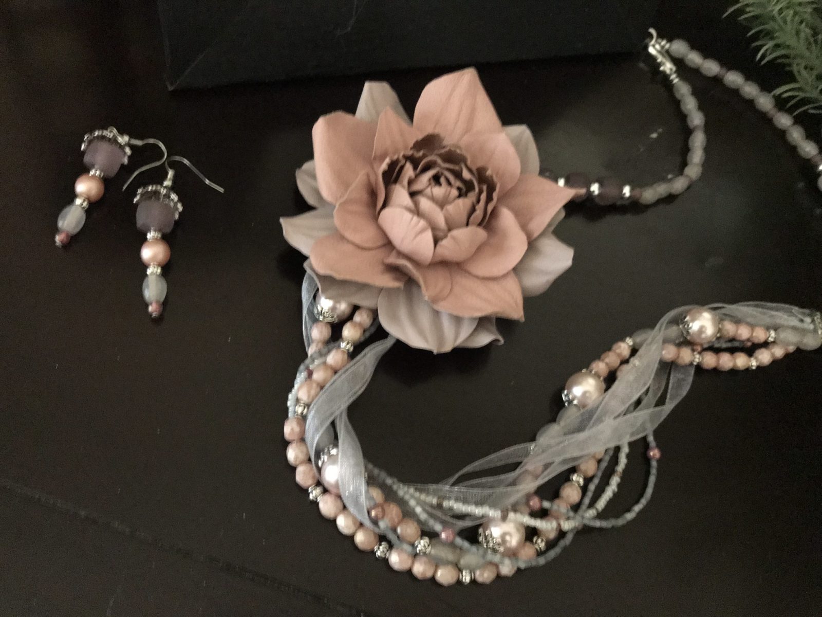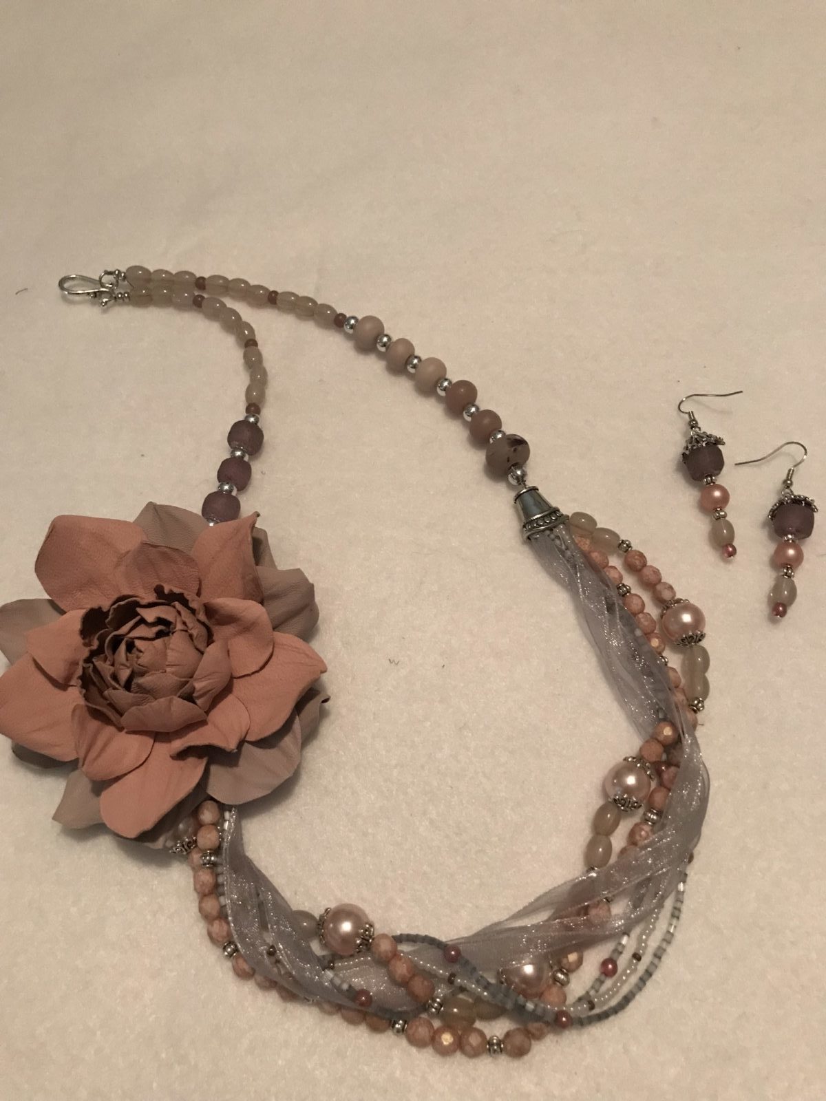 This piece developed from a leather rose I found which had been made in Russia. The color is a muted pink and lavendar…very subtle, almost grayish. I had several kinds of coordinating beads that I had picked up at a going-out-of-business sale some time ago…notice that the bead shapes and types are quite different from each other but coordinate beautifully for this piece.
