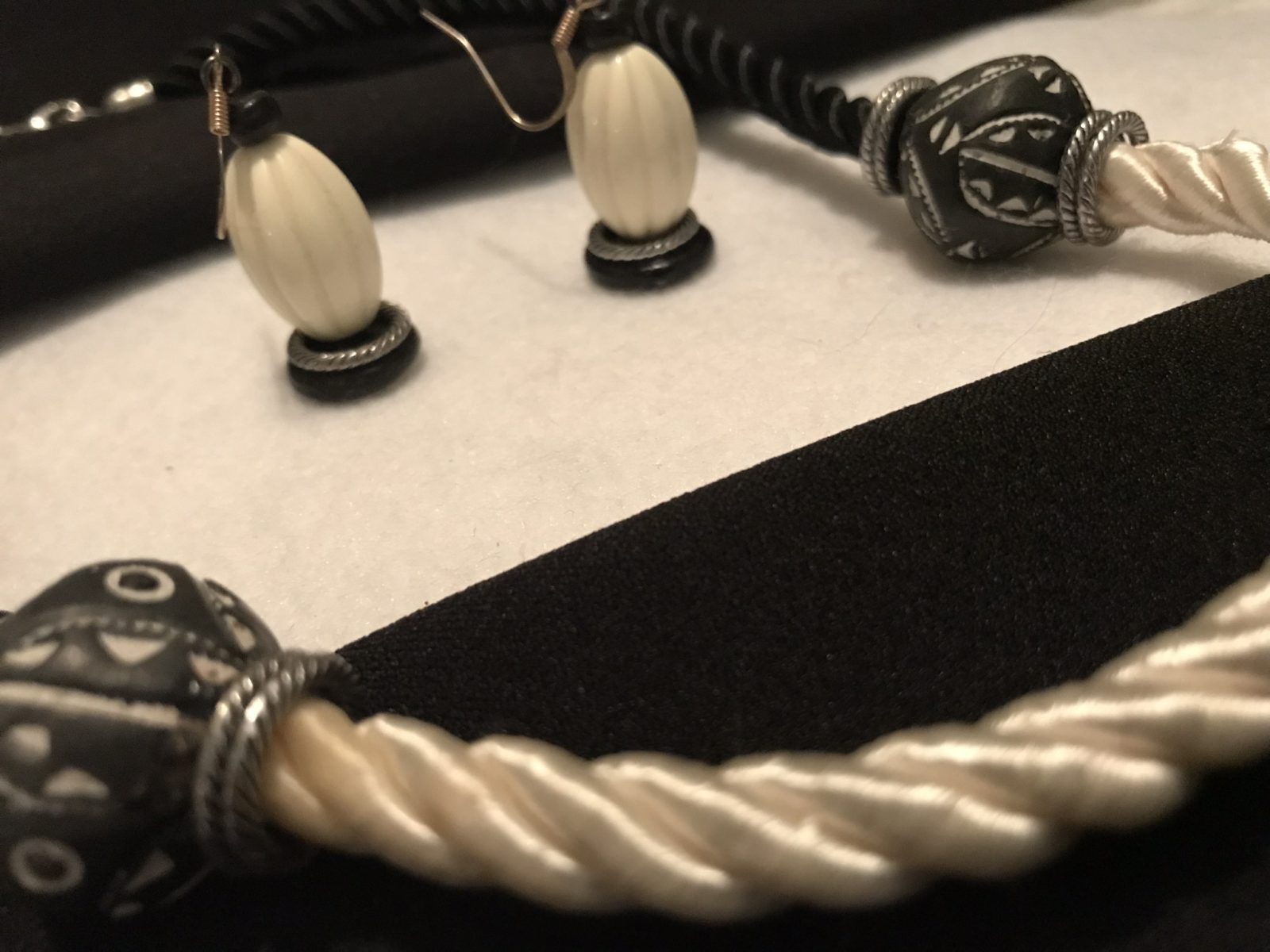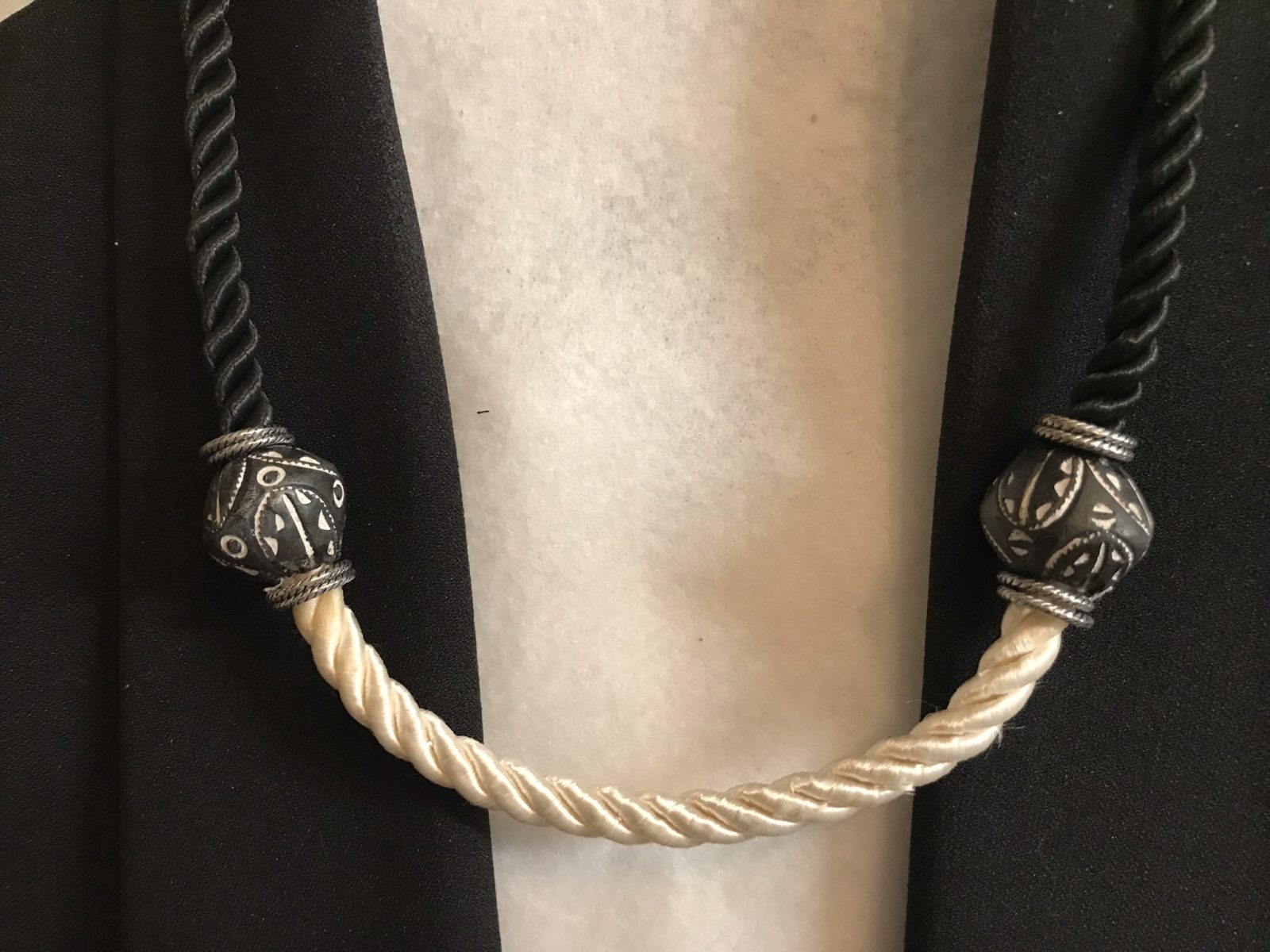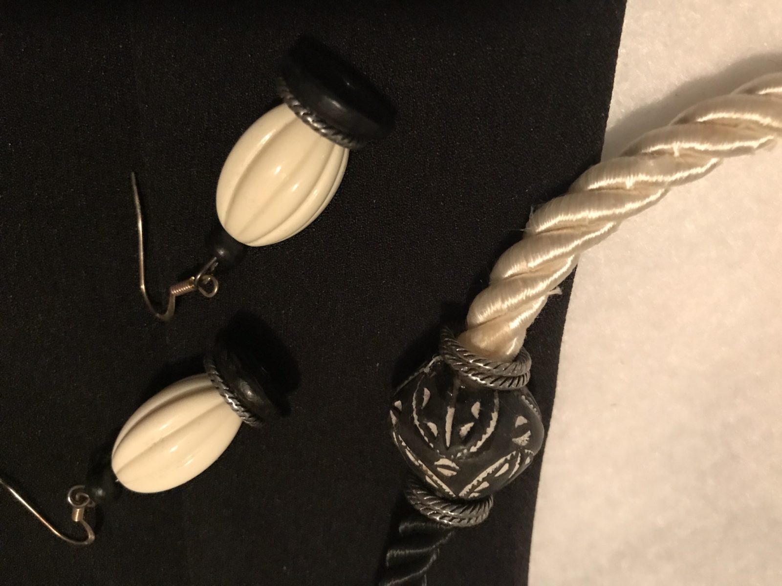 Black and white drapery tie backs are re-purposed to create a soft and comfortable necklace. I found the b&w beads in a trift store and then added some etched metal rings to complete the look. Earrings included.