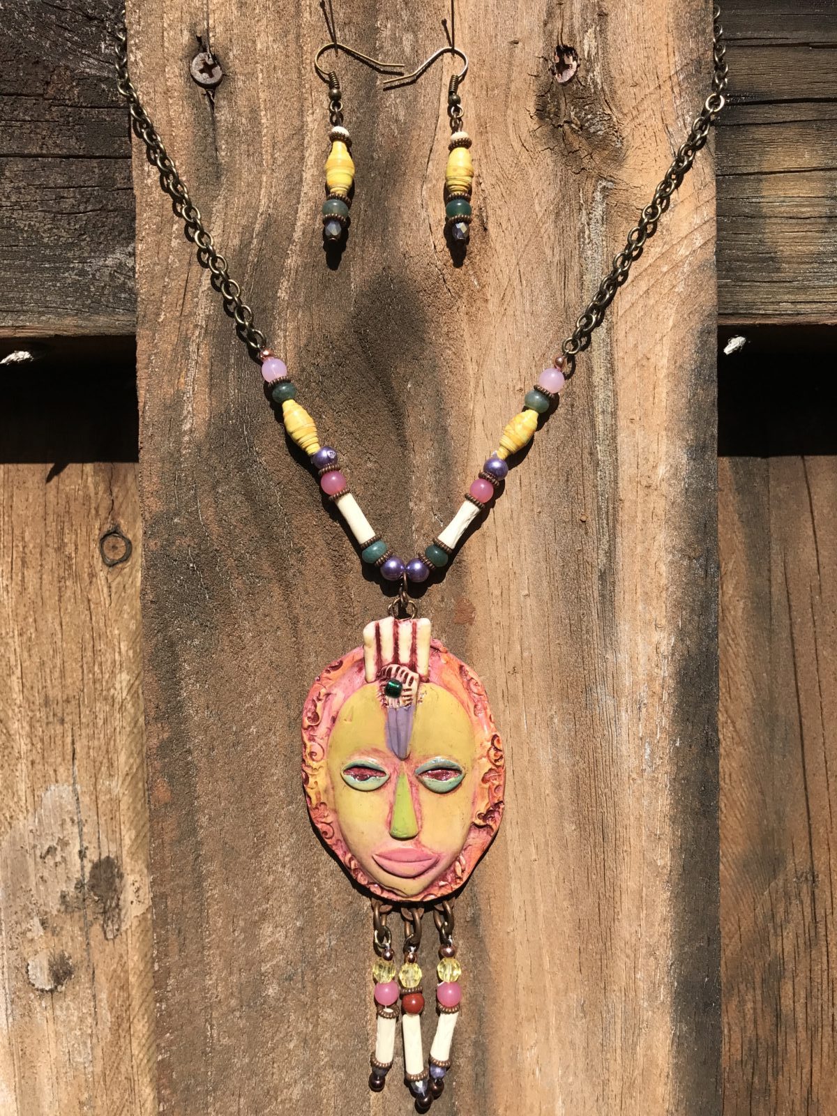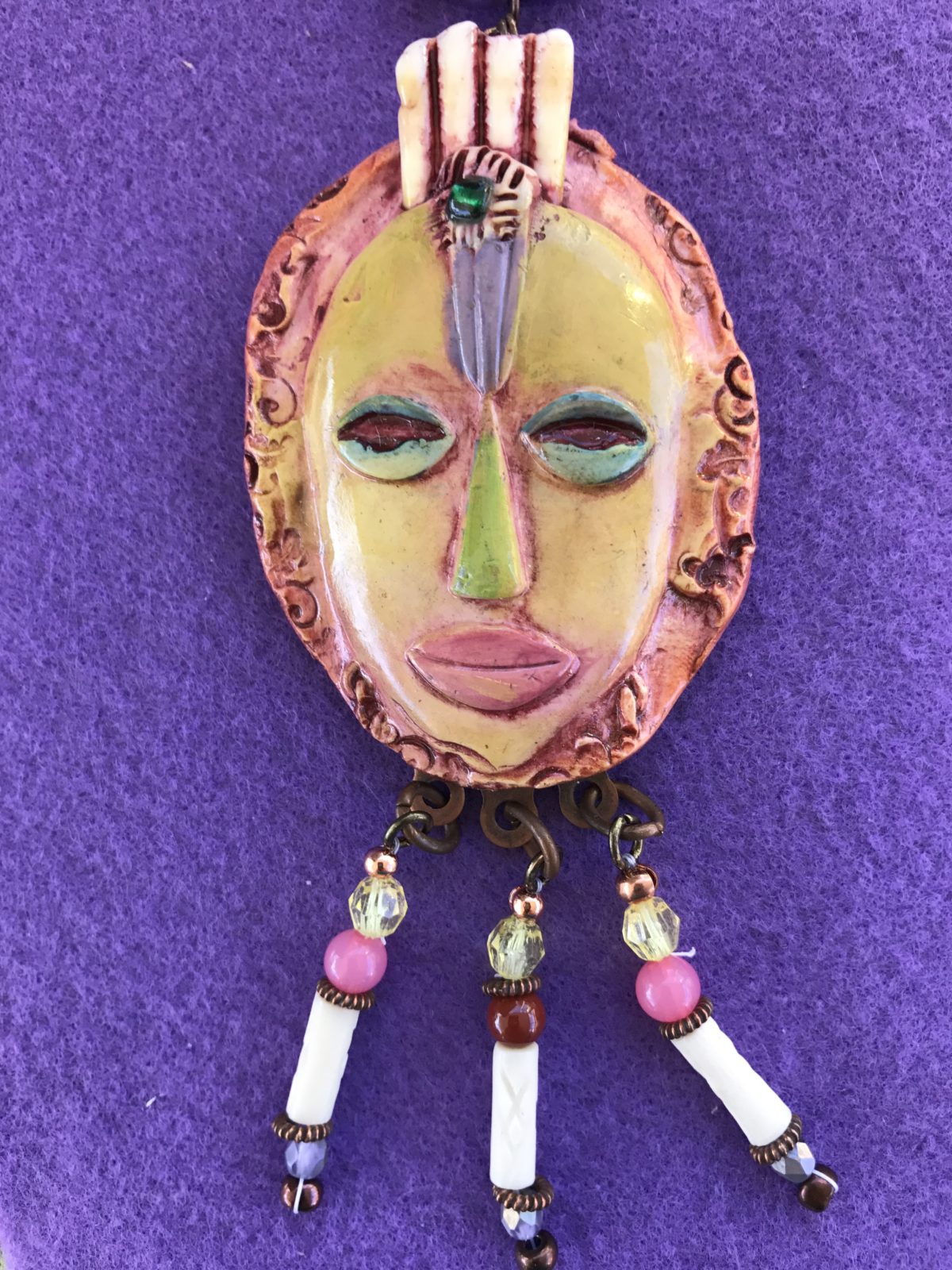 When I saw this medallion I could almost her singing “I feel pretty…I feel pretty”! This is another clay creation I found in the artist’s booth at the weekend fresh market in Hollywood. Such personality in her face! Colors range from pinks to purples to greens. The length is adjustable. Earrings included.