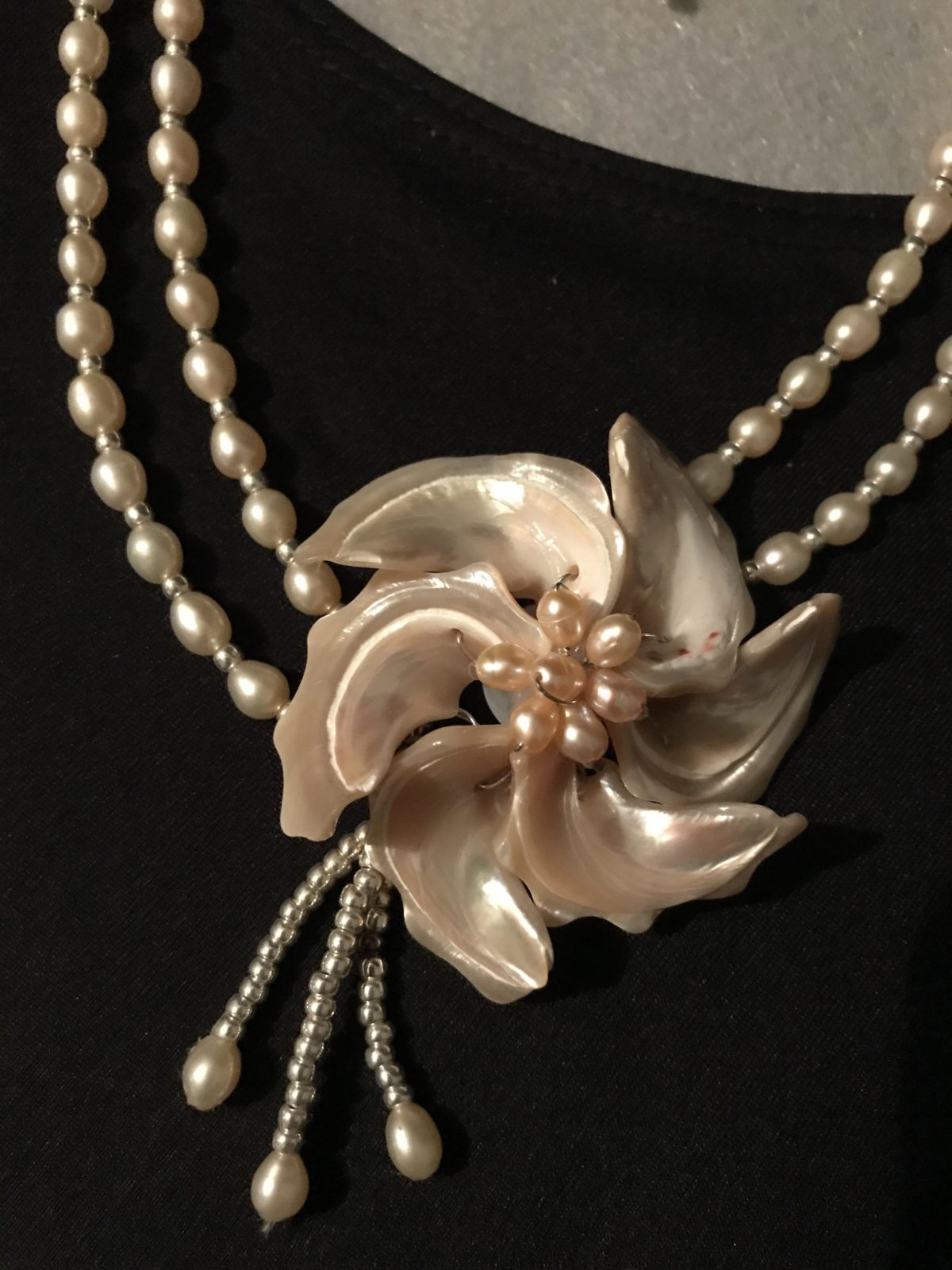 If it were possible for pink to be a little bit golden, that’s how I would describe this delicate color. Off centered on two strands is a flower made of shells. This creation is feminine all the way! There is a spacer bead between each pearl which dresses it up and adds a sparkle. Earings included.