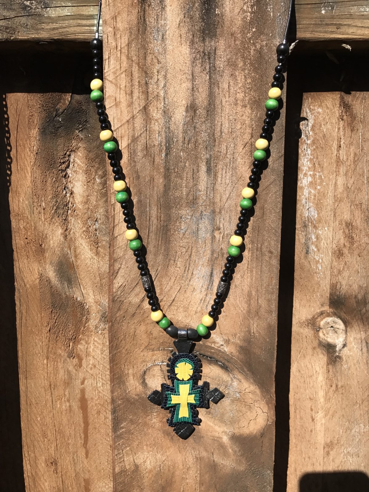 Re-purposed wooden beads and leather scraps come together for this vibrantly-colored cross of yellow, green and black. Click on “other views” to see more cross designs or email me at info@jewelrybybetsy.com for custom colors.