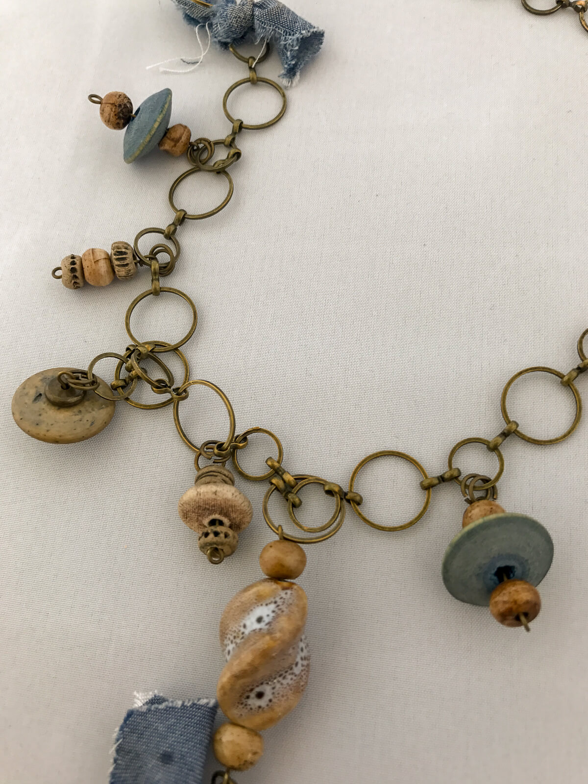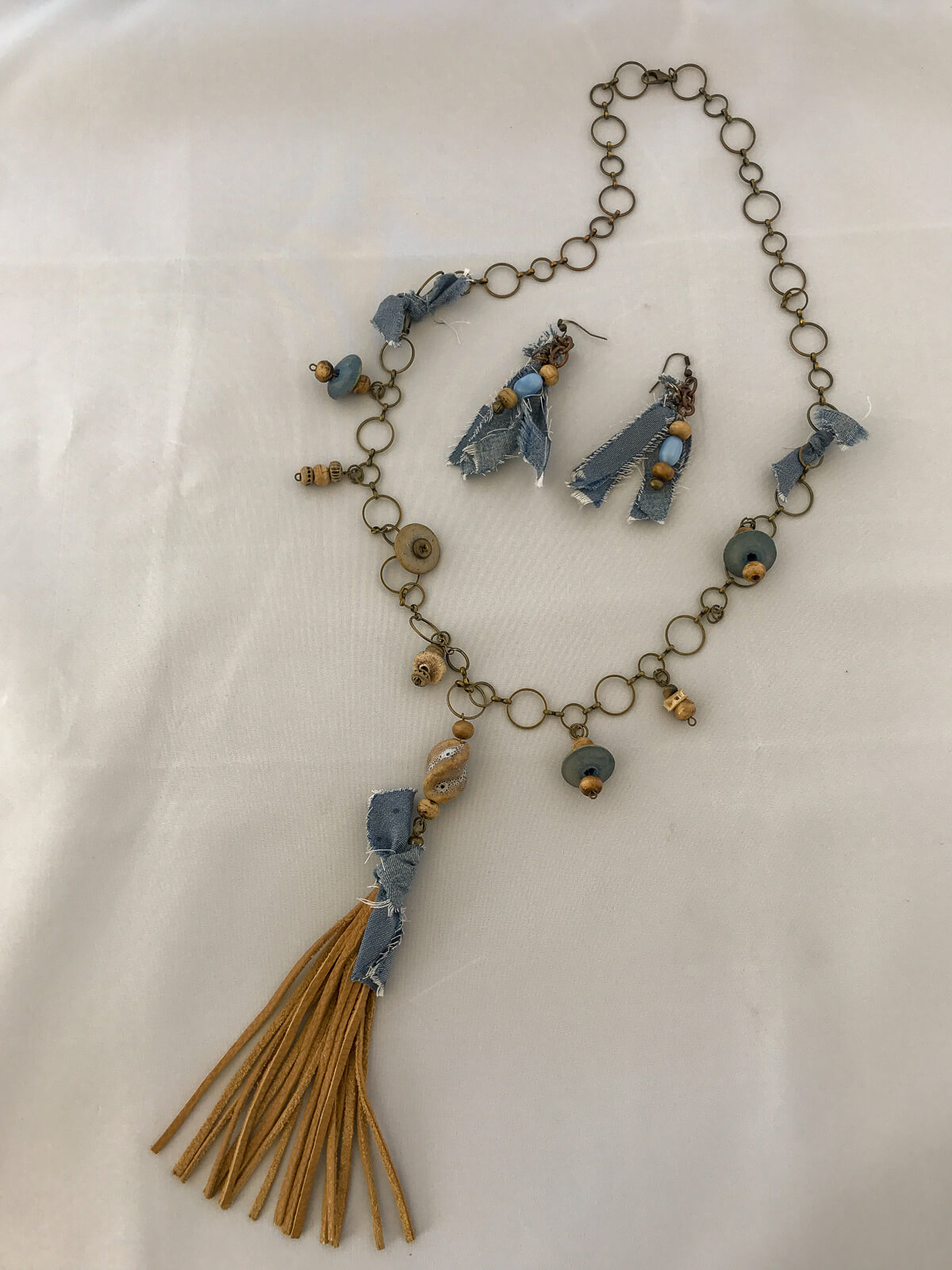 This Western themed necklace is great for the casual look of jeans.  The beaten bronze-look  chain is lightweight and embellished with blue and tan beads.  The tassel is tan leather and tied with a swatch of denim.  The beads are clay and metal, all sourced from thrift stores. Earrings included.