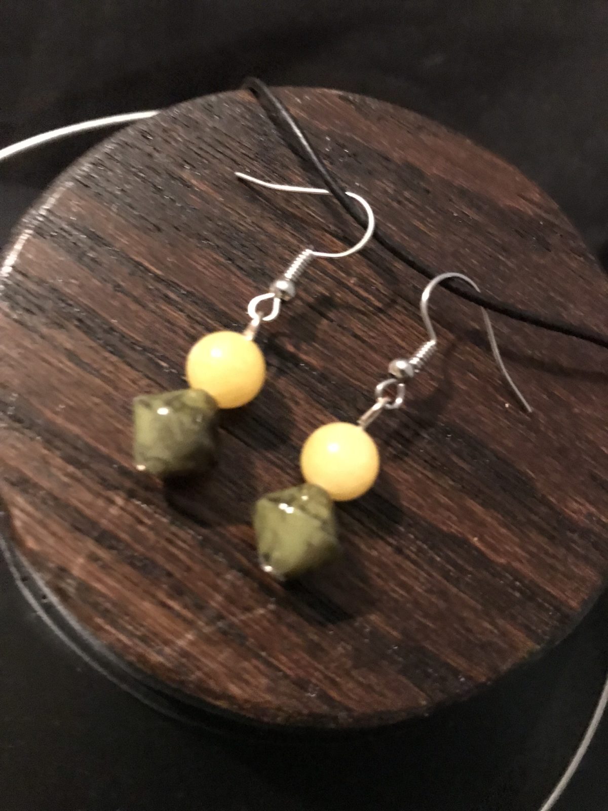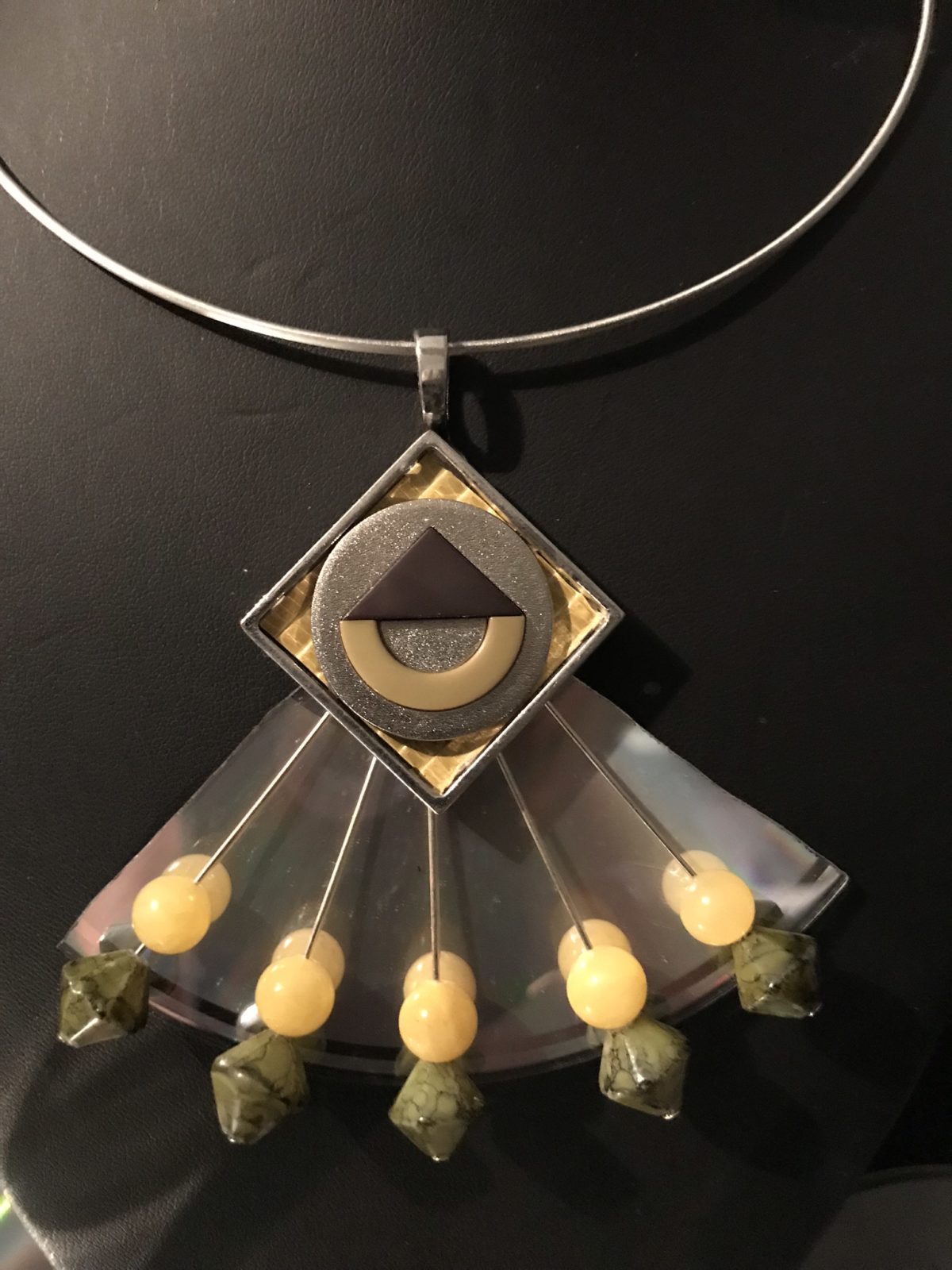 Once cut, I filed the edges smooth. But the next challenge is that the CD surface is easily scratched. It has to be protected with tape while working with it. The tape will also help avoid getting glue where you don’t want it. It is definitely one of the most challenging materials to work with but has a great look and sure promotes lots of conversation! Earrings included.