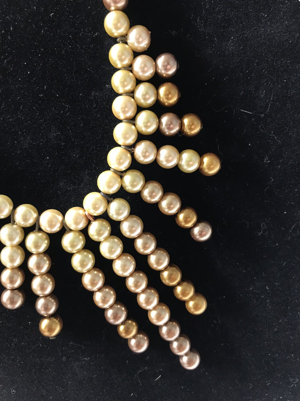Color graduates from golden white to bright gold…there are 3 shiney colors in all. The design makes them look “less stuffy” than the single white strand, but still classy for that business suit. Earrings included.