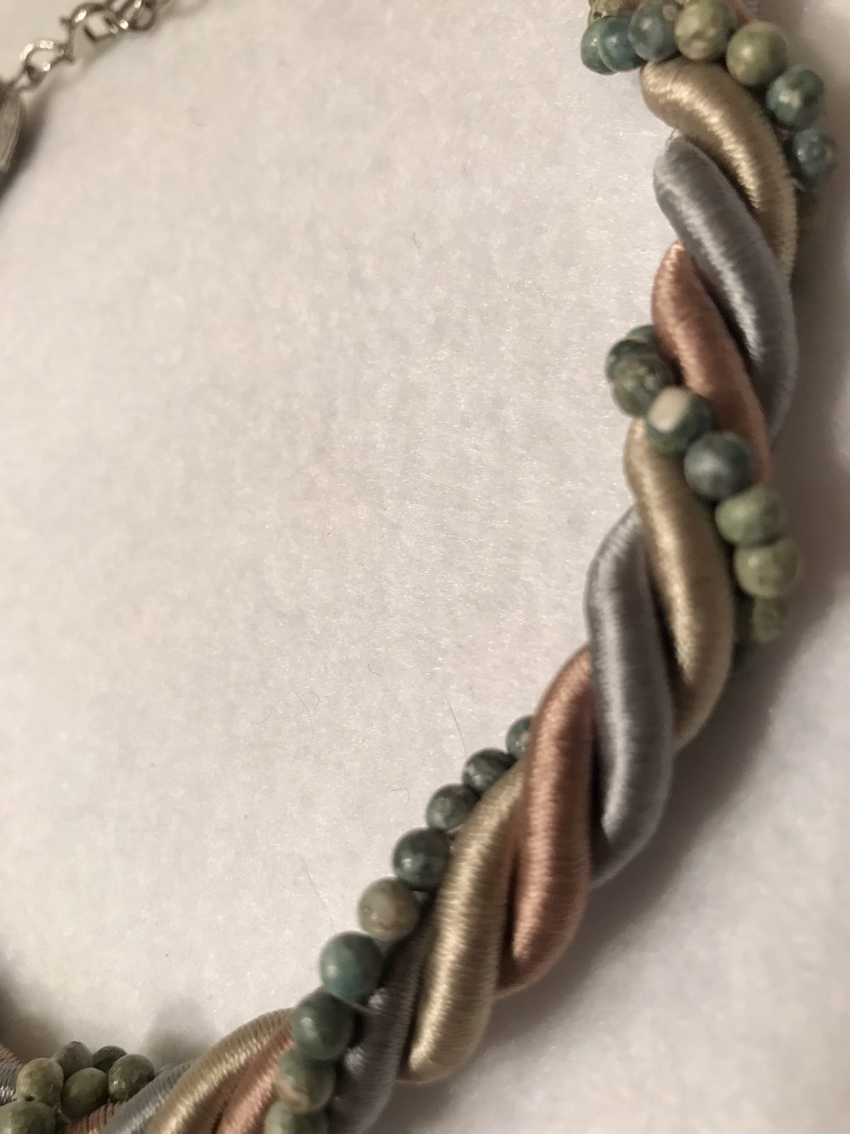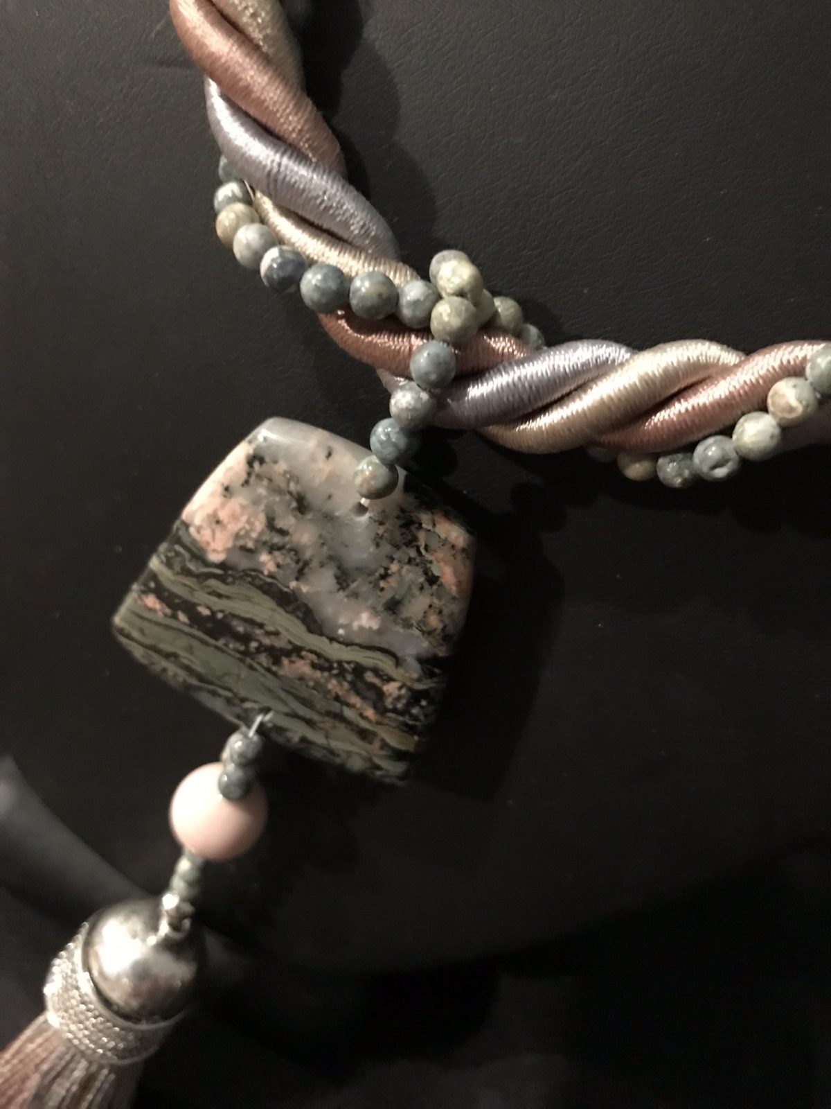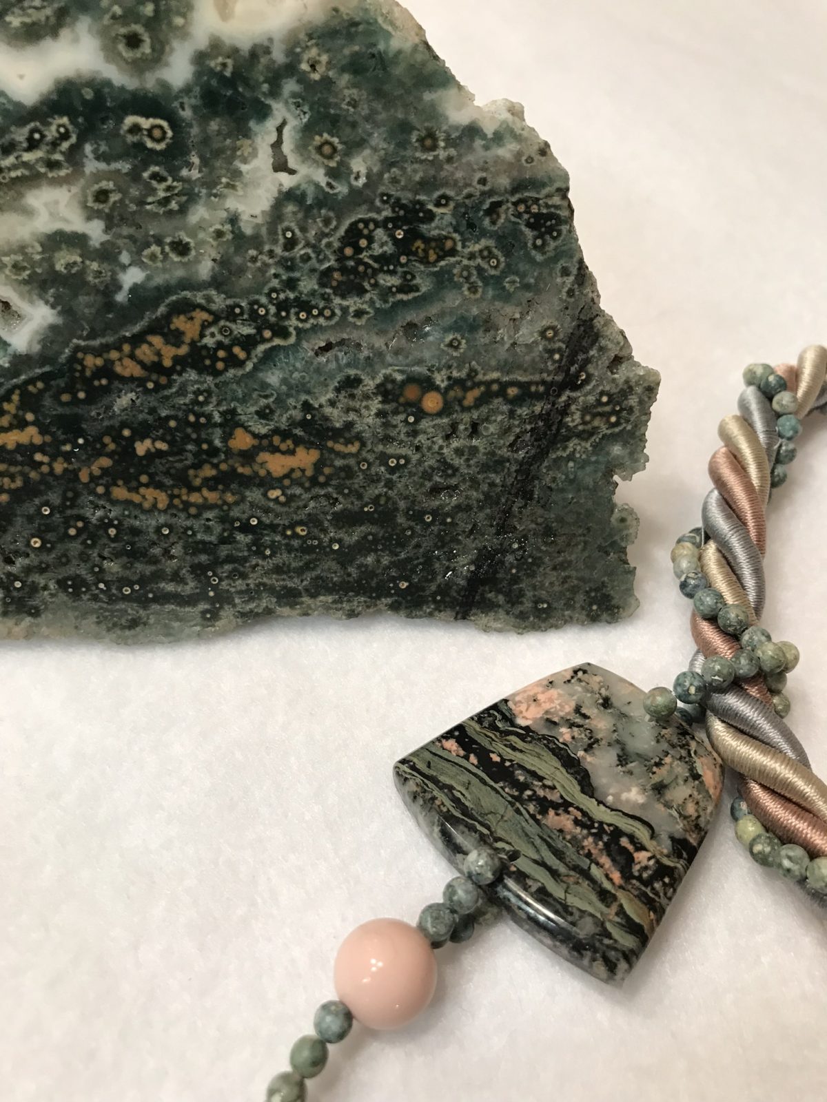 Ocean Jasper is a broad category for rocks used in jewelry. It generally comes from the northwest shore of Madagascar and contains variably-colored orbs or spherical inclusions or zones. This piece is vivid pink and green with black lines running thru it. I matched it with some green beads that are wrapped around a drapery tie back and with a tassel from the same source. Earrings not included.