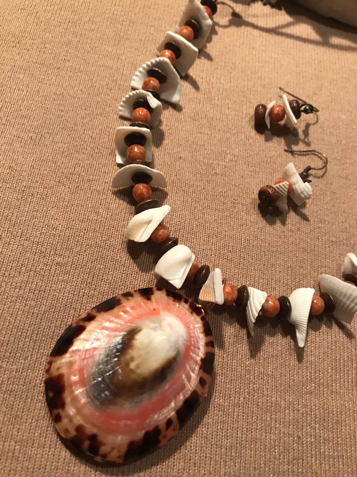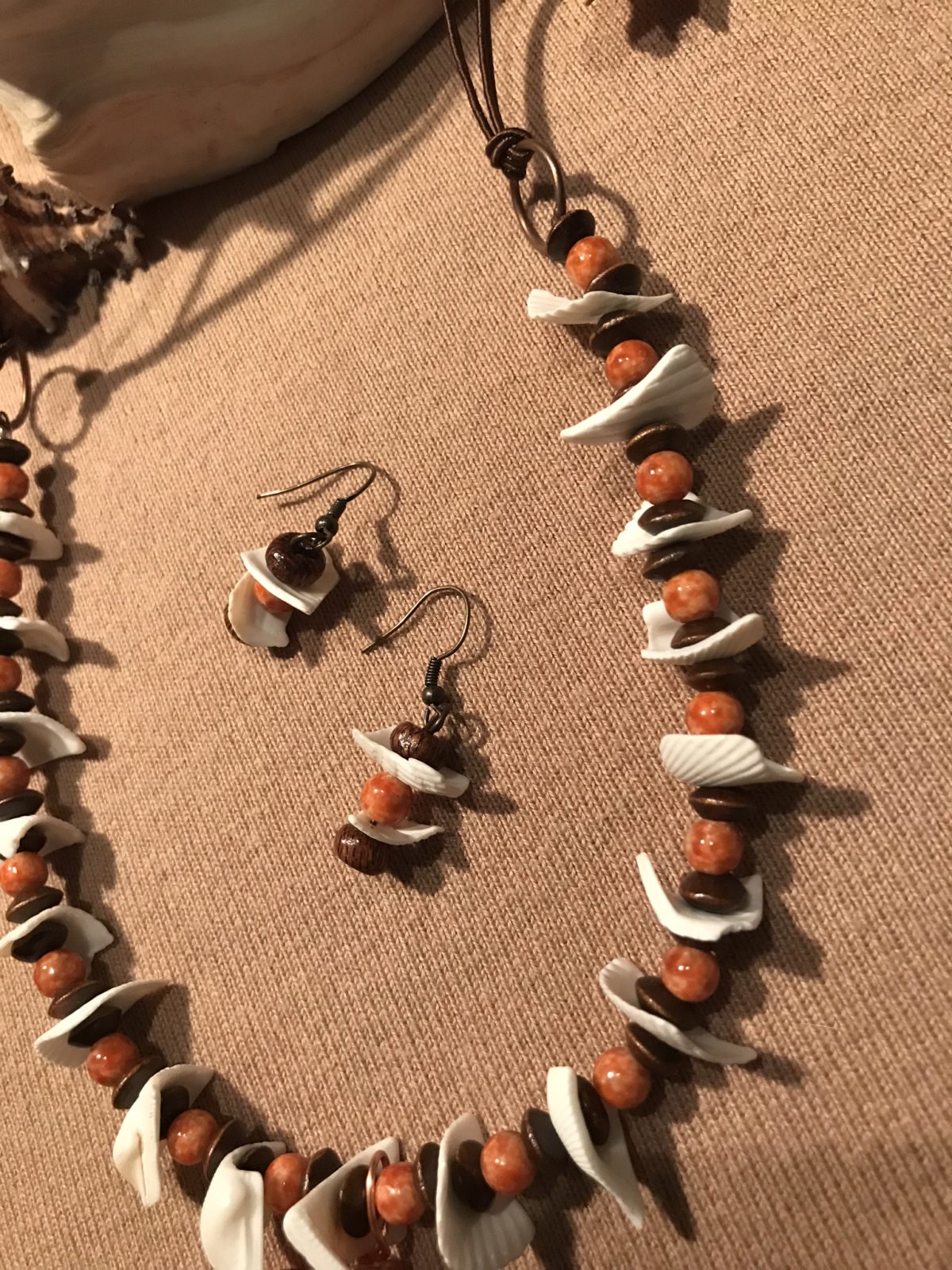 This piece looks fabulous with a brown or beige shirt. The “shell chips” are re-purposed from an outdated necklace I found at a thrift store. Appropriate for casual or dress, it is a bit unusual so it will draw some attention. Earrings included.