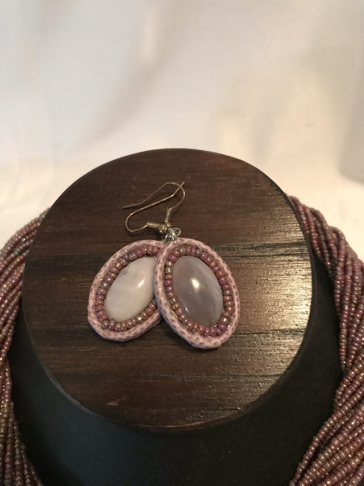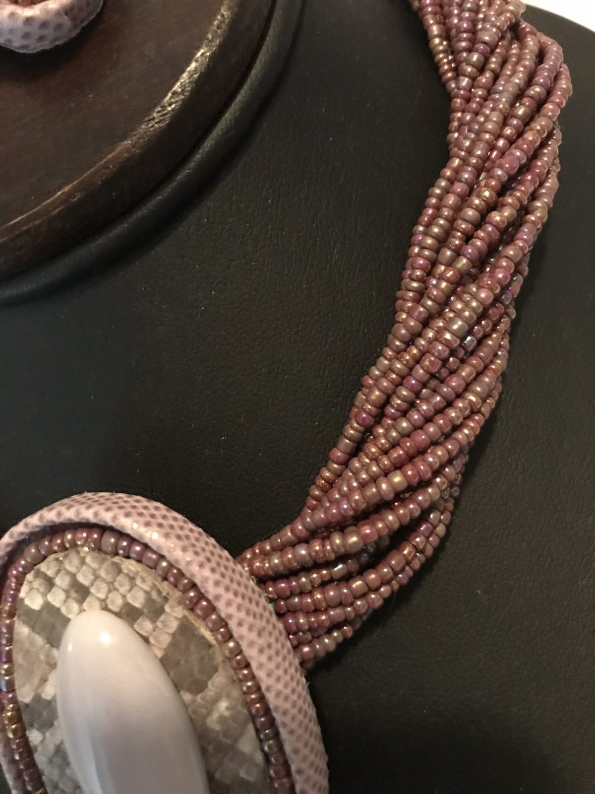 There are all kinds of stories involved with this necklace. The seed beads came from the local thrift store and were unstrung, washed and re-strung. The leather behind the stone in the necklace was scrap from a handbag designer. The stones are called Purple Florite which my husband cut and polished in the lapidary shop.