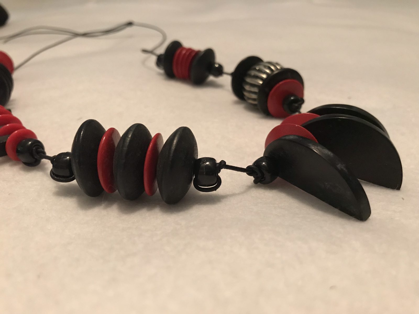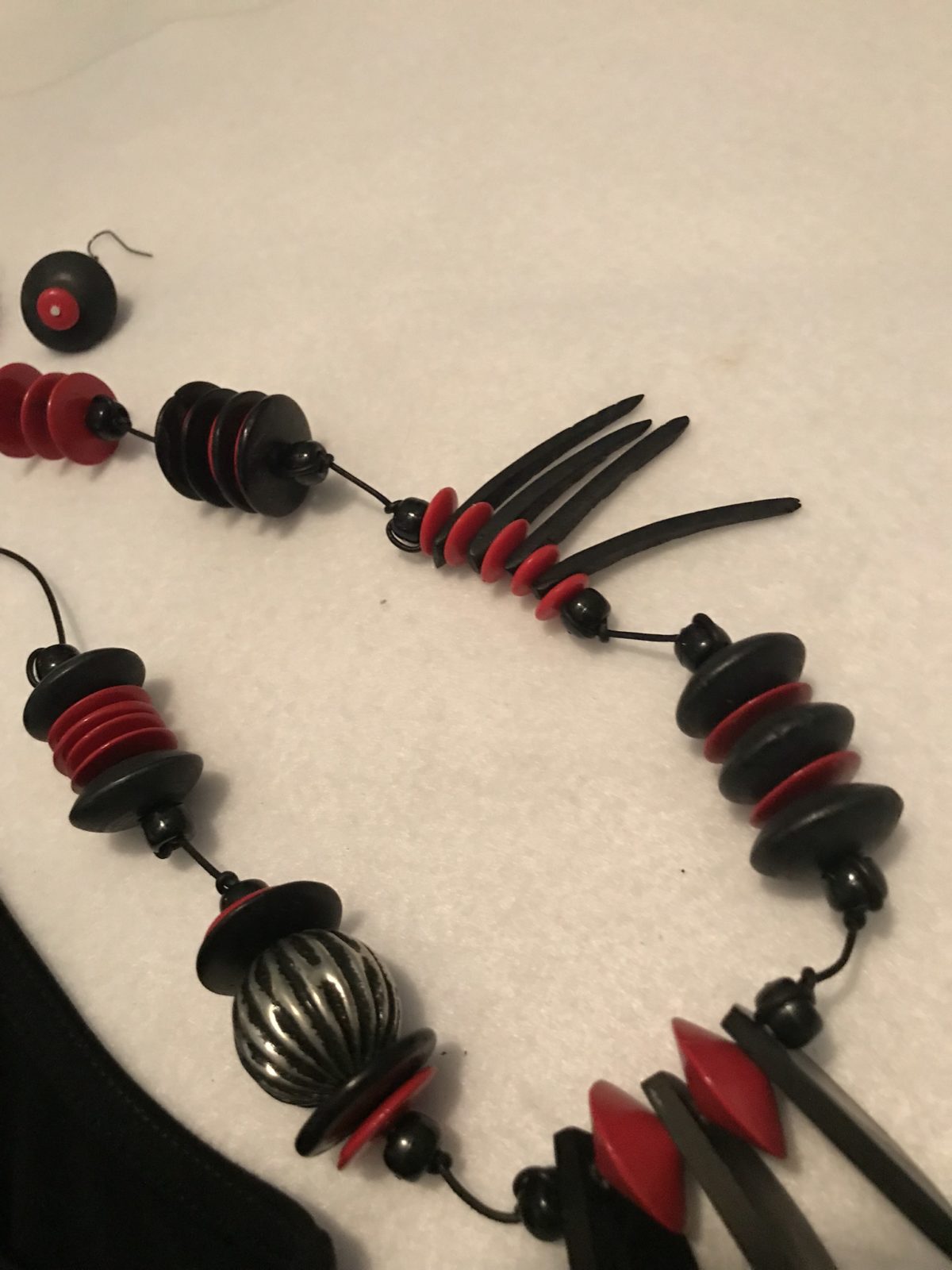 I find it particularly freeing to develop these chaotic designs as my day-to-day life style has always been so predictable and organized! Sticking to the colors red and black, the design of this piece is wild and crazy. The wooden beads are very light weight so it is comfortable to wear. Get ready for some “lookers” when you wear this one. Earrings included.