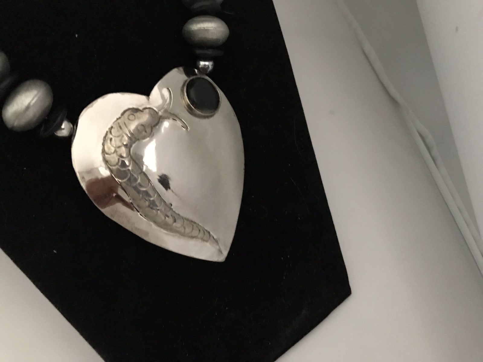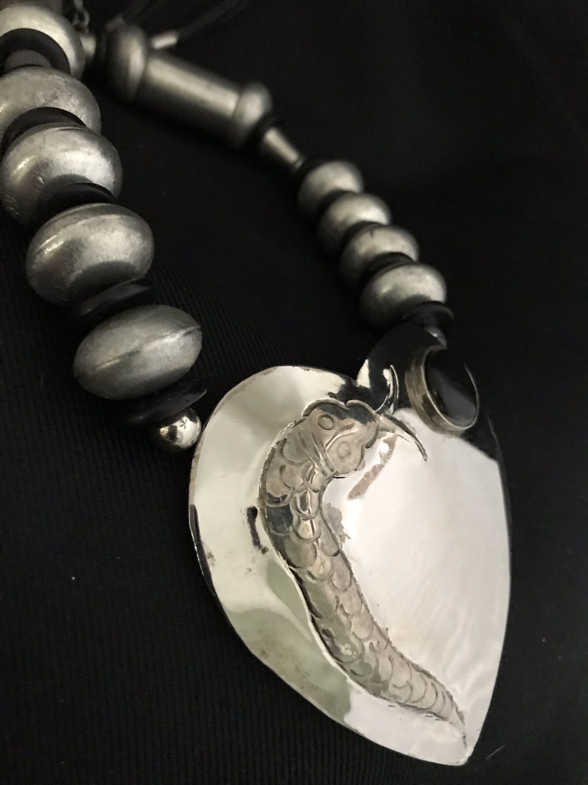 This necklace looks very heavy due to the large silver beads and medallion. The beads, however, are lightweight wood that I spray painted silver. The medallion is aluminum with an onyz cabachon. So you will find that it is light and comfortable to wear.