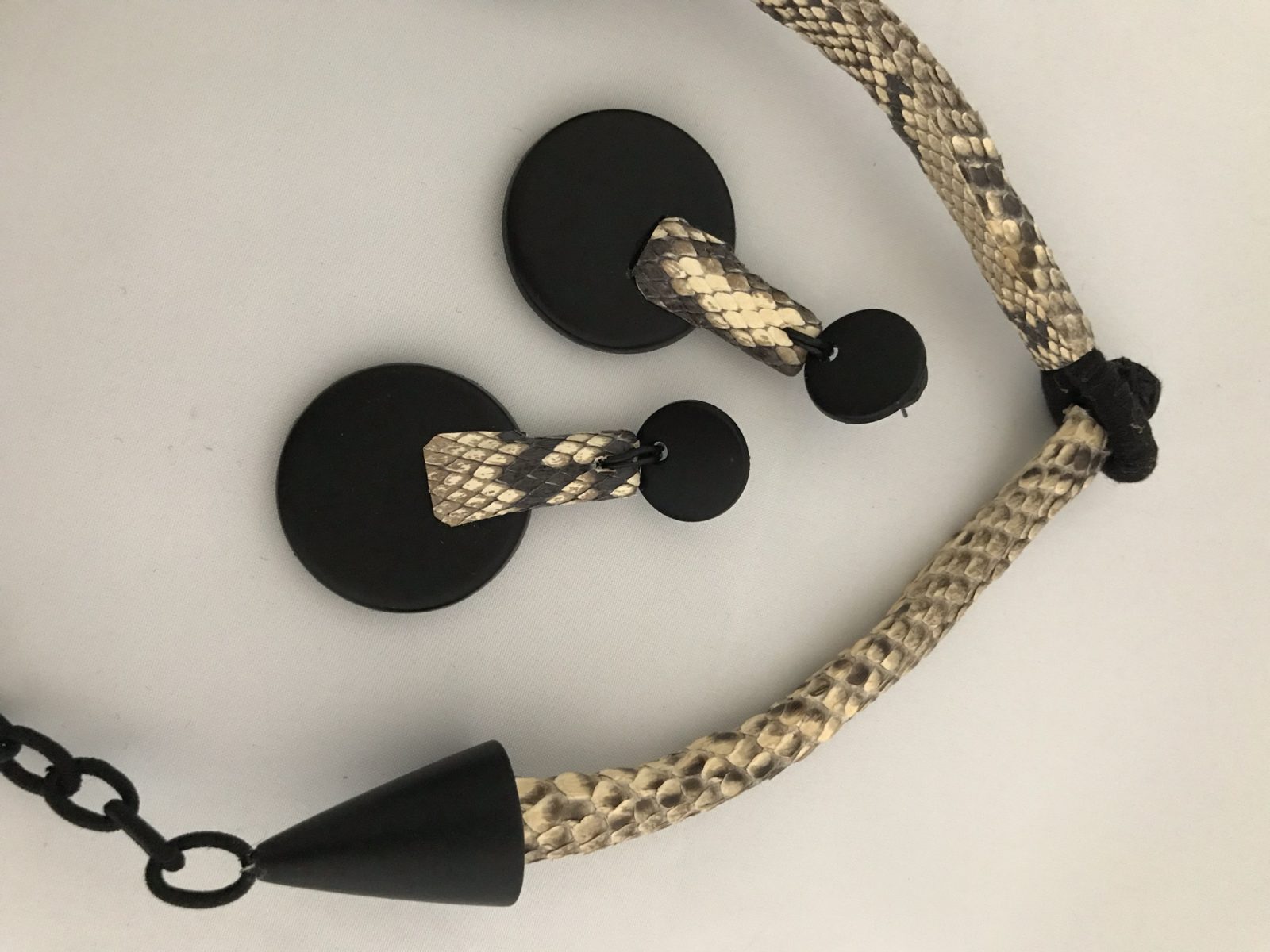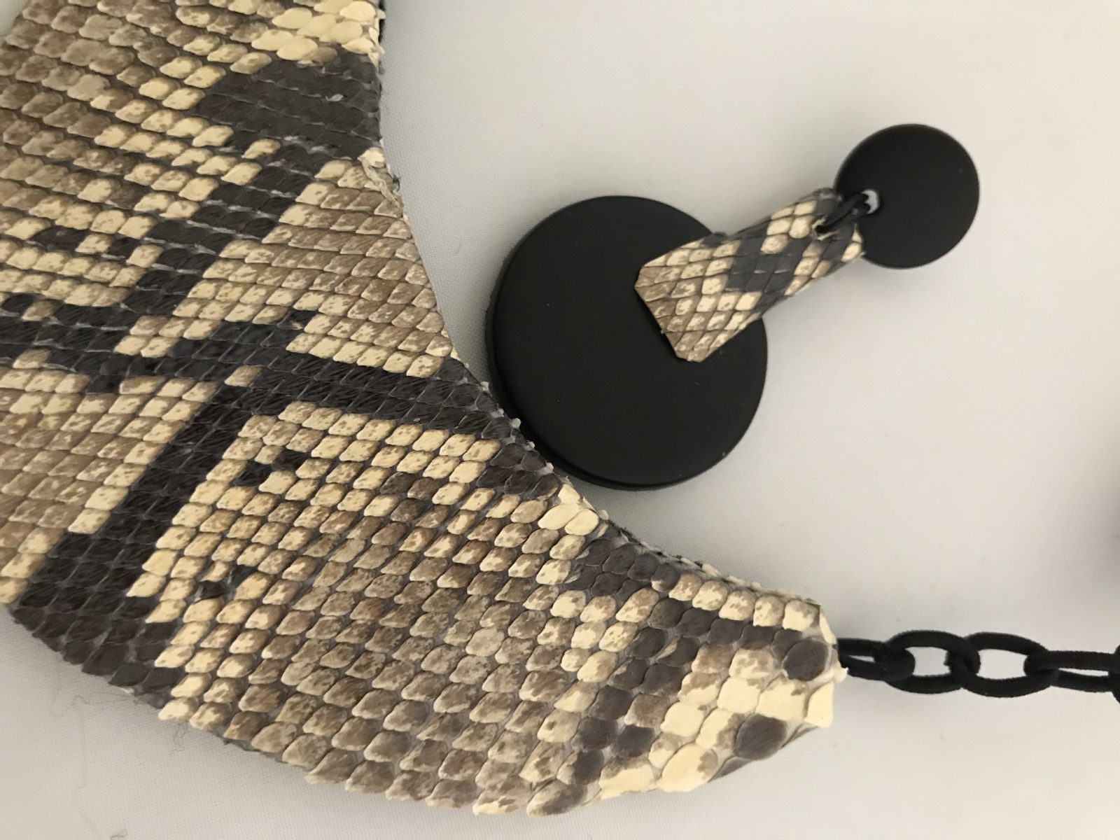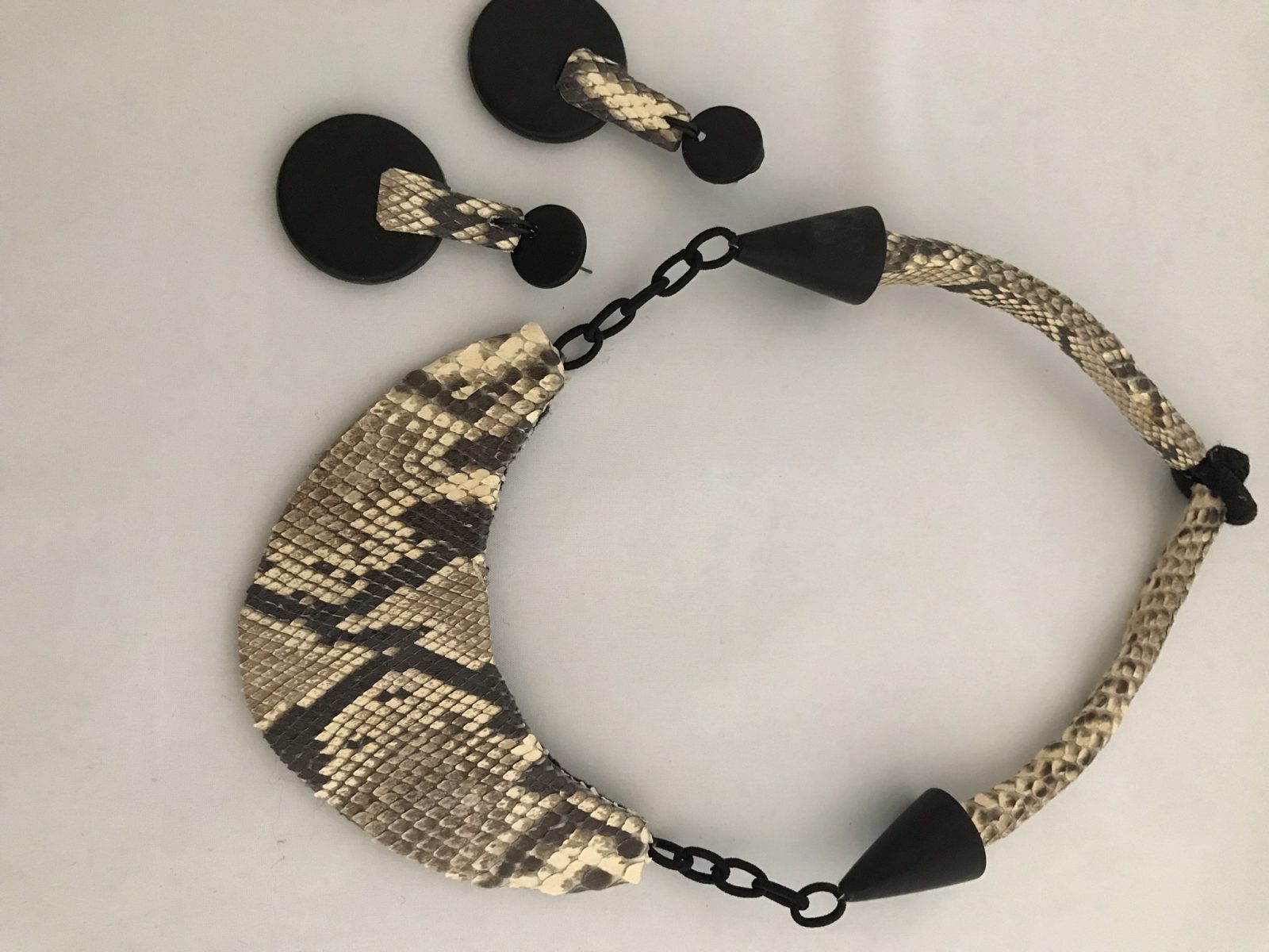 The materials used to construct this stylish design came from numerous sources. The star of this show is definitely the beautiful python skin which was scrap leather from a handbag designer. I then painted some salvaged wooden cones in black and connected the pieces with some textile chain I found at a jewelry show in Melbourne. This piece has a very sophisticated look. Earrings included.
