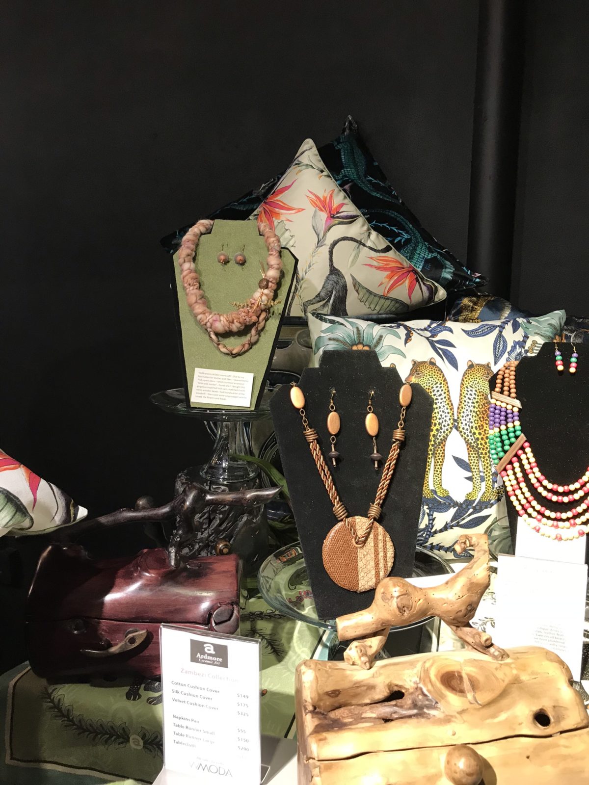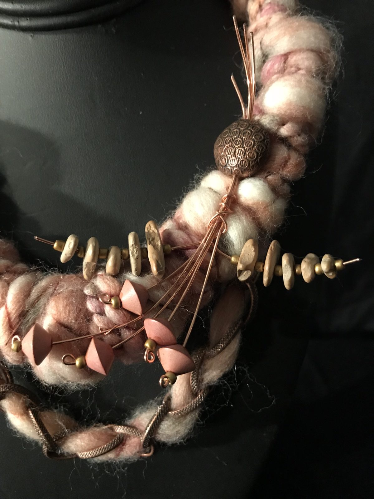 YARN meets WOOD meets ART…due to my fascination for textiles and fiber, I researched to find a yarn store – which is almost an extinct “brick and mortar”…but I found one. There I bought this gorgeous imported Irish yarn, matched it with wooden beads and some copper wire to produce a necklace with a mini sculpture.
